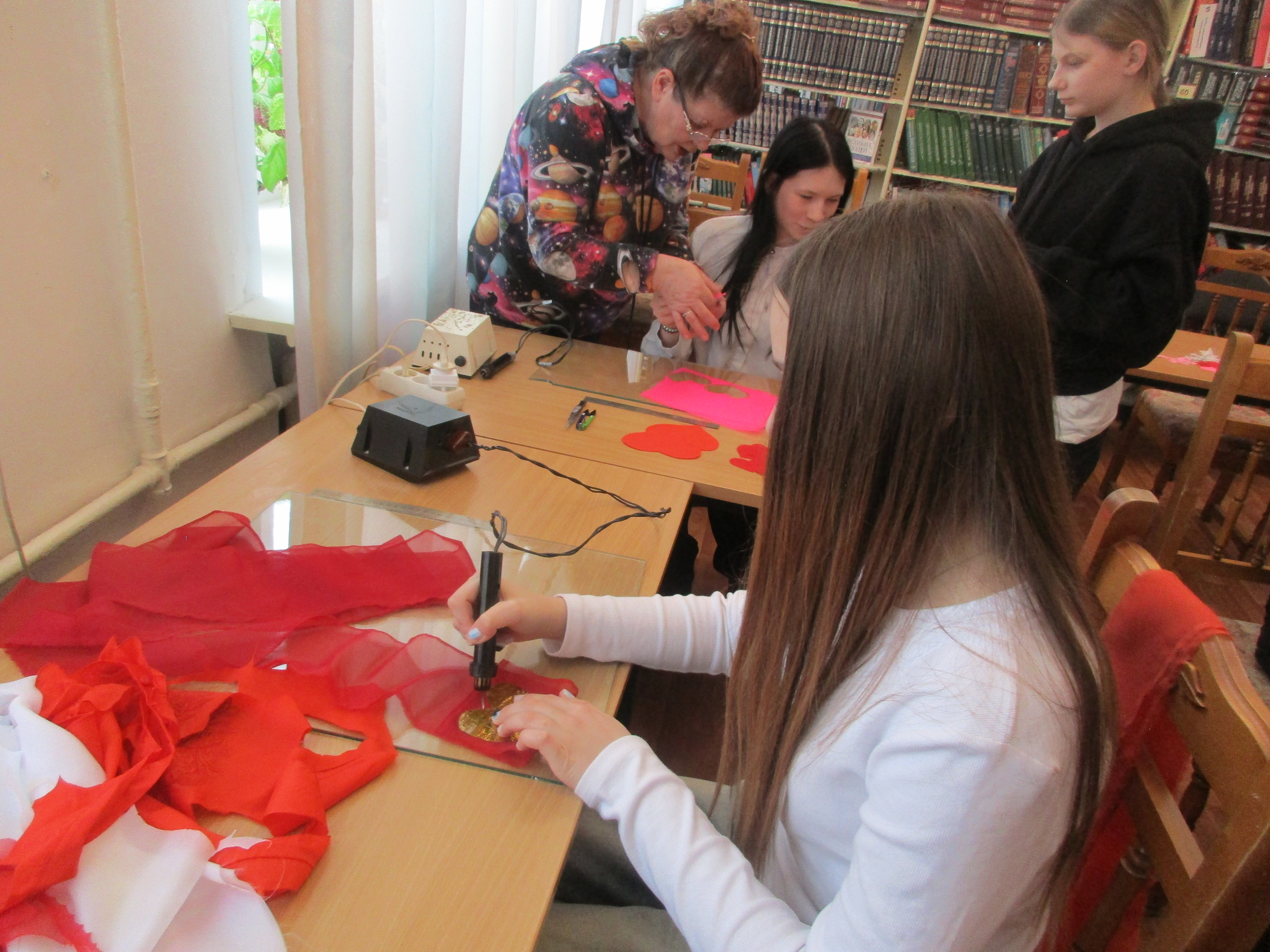 Провела мастер-класс Мукатанова Любовь Георгиевна. Дело оказалось нелегким, но очень увлекательным. Сердца рисовали на бумаге, делали лекало из металла, а затем с помощью выжигательного прибора и искусственных тканей создавали прекрасные творения – сердечки.