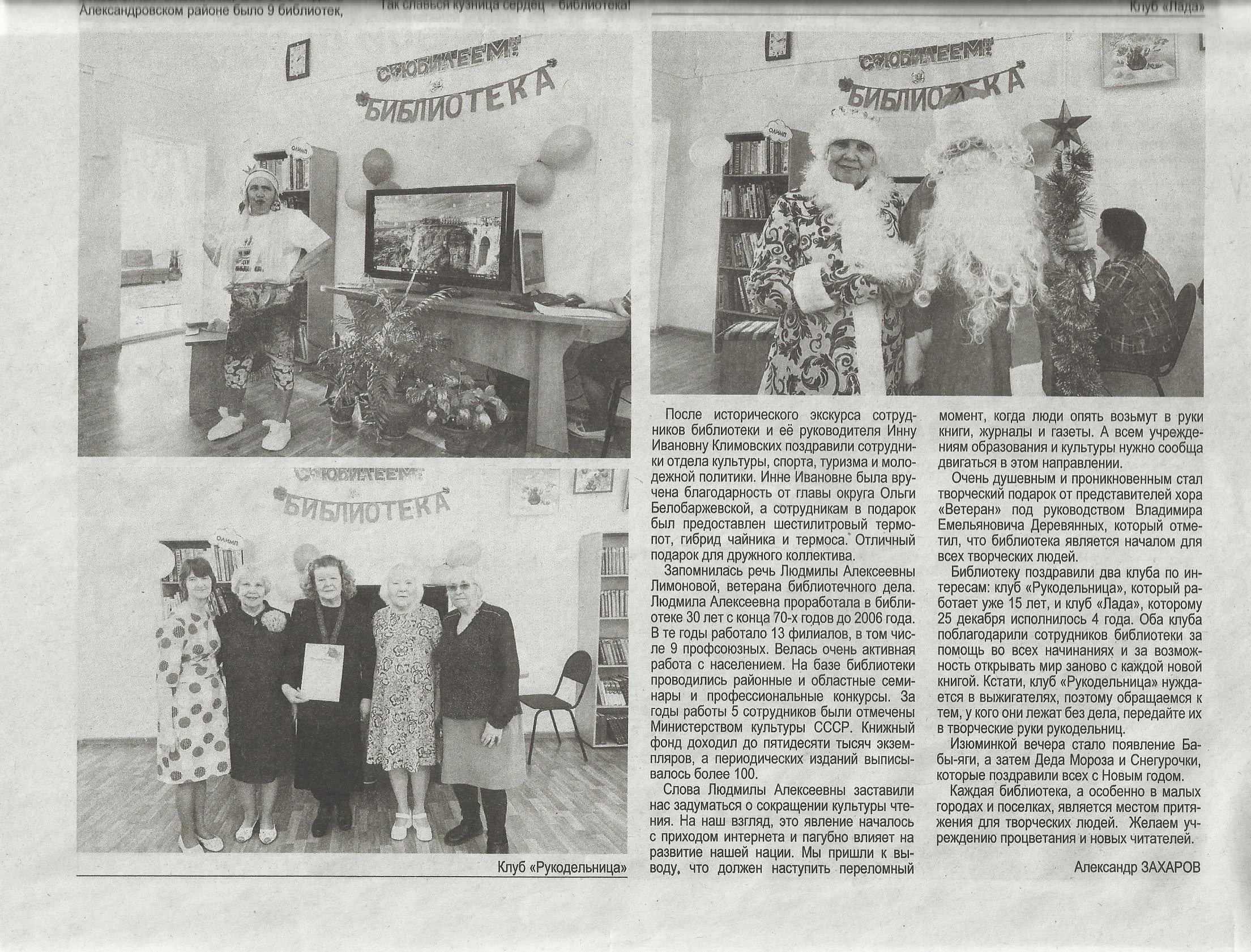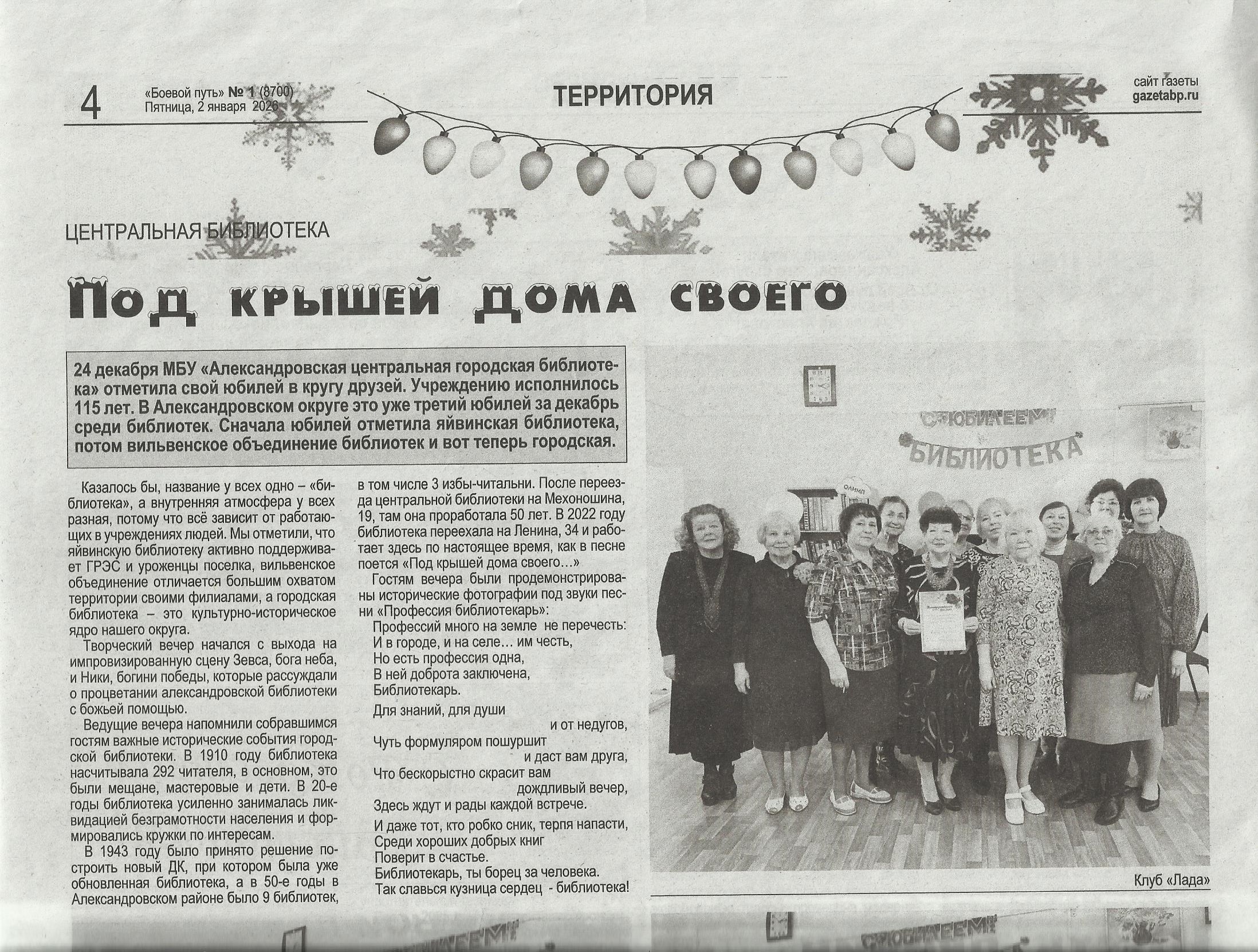 24 декабря МБУ «Александровская центральная городская библиотека» отметила свой юбилей в кругу друзей. Учреждению исполнилось 115 лет. В Александровском округе это уже третий юбилей за декабрь среди библиотек. Сначала юбилей отметила Яйвинская библиотека, потом Вильвенское объединение библиотек и вот третий городская.