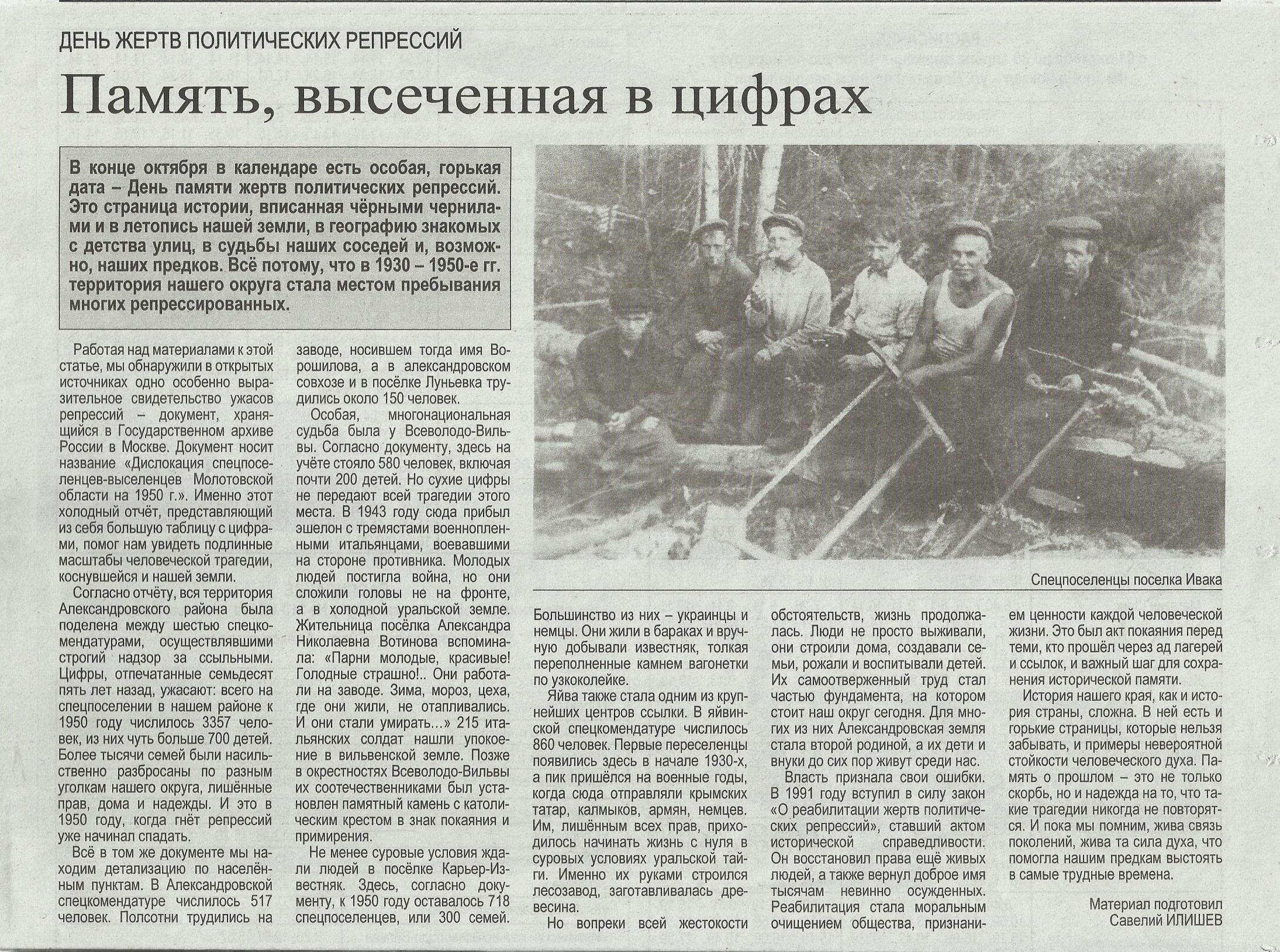 С 1929 по 1956 годы города Кизел и Соликамск и прилегающие к ним территории являлись одними из крупных «островов» Архипелага ГУЛАГ. Более половины населения этих районов составляли так называемые «спецконтингент» – семьи раскулаченных и высланных крестьян, трудармейцы – депортированные немцы Поволжья и крымские татары.
